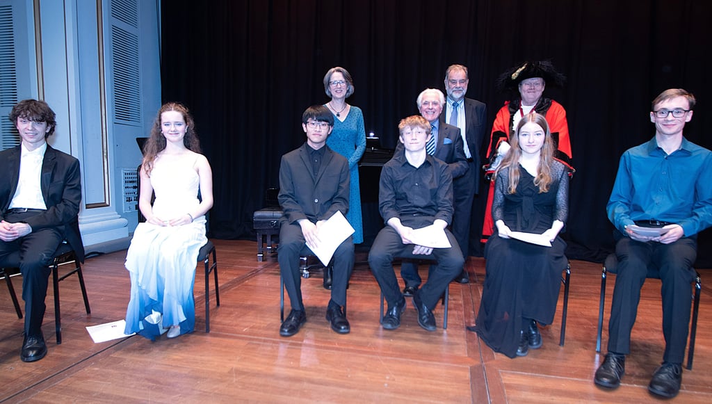 Finalists in the 2024/25 competition, with the Deputy Lord Mayor of Bristol, Paul Goggin, and the team of adjudicators led by international concert pianist Allan Schiller.